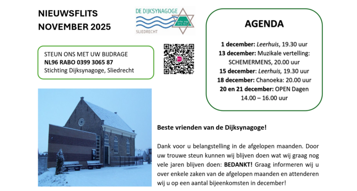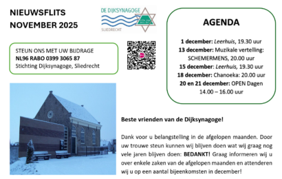 Beste vrienden van de Dijksynagoge!Dank voor u belangstelling in de afgelopen maanden. Dooruw trouwe steun kunnen wij blijven doen wat wij graag nogvele jaren blijven doen: BEDANKT! Graag informeren wij […]