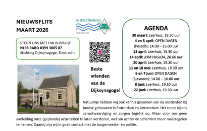 Beste vrienden van de Dijksynagoge! Natuurlijk hebben wij ook kennis genomen van de incidenten bij Joodse gebouwen in Rotterdam en Amsterdam. Het roept bij ons verontwaardiging en zorgen tegelijk op. […]